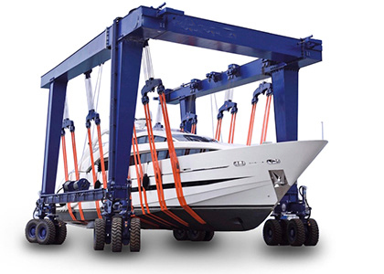 MBH船艇搬運機用于船廠、游艇俱樂部、水上娛樂中心、海軍等,主要用于船艇的維修和保養(yǎng)出入水工作,該設(shè)備額定起重量為32~800t,全液壓驅(qū)動,采用柔性吊裝帶兜住船體底部,多吊點同時起吊,運行和轉(zhuǎn)向方式變化多樣,一般有直行,斜行,阿克曼轉(zhuǎn)向,原地回轉(zhuǎn),八字轉(zhuǎn)向等,根據(jù)客戶的不同需求進行不同的配比。