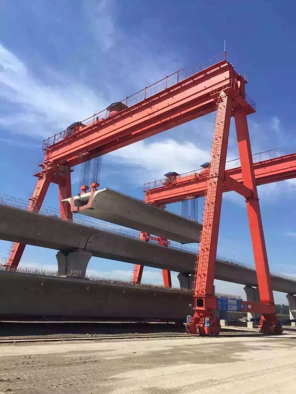 該設(shè)備既可兩臺配合抬吊預(yù)制梁,也可以單臺起重機配雙吊具起吊預(yù)制梁,兩臺同時起重的提梁機各自的起重量一般為450噸,單臺起重的提梁機起重量通常可達900噸。它配置支腿行走、天車行走及天車起吊設(shè)備,可以實現(xiàn)全方位機械化動作。主要用于將預(yù)制梁從制梁臺提吊至存梁臺位,預(yù)制梁養(yǎng)護完成后將其從存梁臺位吊運到運梁車上。作為起重設(shè)備完成架橋機的組裝和拆卸。還用于架設(shè)墩身不高的旱橋。